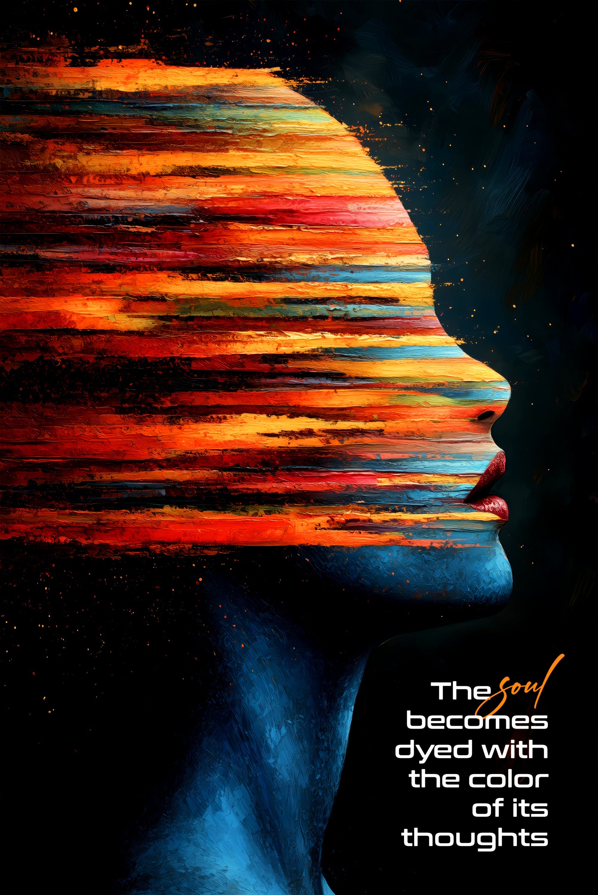 Sıradan bir baskı değil. Dyed Thoughts, kontrast üzerine inşa edilmiştir—derin, sinematik mat siyahların arasından geçen cesur kromatik fırça darbeleri ve hareket ettikçe renk bantlarını ve tipografiyi aydınlatan seçici yüksek parlak lak dokunuşları.